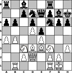 game notation in PGN-format [Event "martinus Open"] [Site "www.myChess.de"] [Date "2010.06.02"] [Round "1"] [White "Schachfedi"] [Black "herieg26928 (adv.)"] [ECO "A05"] [WhitemyELO "1787"] [BlackmyELO "1833"] [Result "1/2-1/2"] [TimeControl "10/1728000"] [WhiteDays "19"] [BlackDays "33"] [MyChessNo "66026"] 1. Nf3 Nf6 2. d4 g6 3. Nc3 Bg7 4. e4 d6 5. Bd3 O-O 6. O-O Nc6 7. h3 e5 8. d5 Nb8 9. Bg5 h6 10. Be3 Qe7 11. Qd2 Kh7 12. Rab1 a6 13. b4 Nbd7 14. a4 b6 1/2-1/2 position notation in FEN-format r1b2r2/2pnqpbk/pp1p1npp/3Pp3/PP2P3/2NBBN1P/2PQ1PP1/1R3RK1 - - - 0 15 Captured white pieces: Captured black pieces: Click on a captured piece in order to display the desired move!