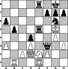game notation in PGN-format [Event "YOUR LAST BREATH"] [Site "www.myChess.de"] [Date "2019.11.17"] [Round "2"] [White "wolni55"] [Black "beowulf"] [ECO "B20"] [WhitemyELO "1359"] [BlackmyELO "1352"] [Result "0-1"] [TimeControl "10/3456000"] [WhiteDays "40"] [BlackDays "40"] [MyChessNo "116363"] 1. e4 c5 2. Bc4 Nc6 3. d3 d6 4. h3 Nf6 5. Nc3 e6 6. Bg5 Be7 7. Nf3 O-O 8. a3 a6 9. g4 d5 10. Bxf6 Bxf6 11. exd5 exd5 12. Nxd5 Re8+ 13. Ne3 Bxb2 14. Rb1 Bd4 15. Qd2 Be6 16. Bxe6 Rxe6 17. O-O Qf6 18. Ne1 b5 19. Nd5 Qh4 20. Kg2 Rae8 21. Nf3 Qd8 22. Nf4 R6e7 23. Rfe1 Ne5 24. Nxd4 cxd4 25. Qb4 Nc6 26. Qd2 Ne5 27. Ne2 Qd5+ 28. Kg3 Qf3+ 29. Kh4 Ng6+ 30. Kg5 Re5# 0-1 position notation in FEN-format 4r1k1/5ppp/p5n1/1p2r1K1/3p2P1/P2P1q1P/2PQNP2/1R2R3 - - - 12 31 Captured white pieces: Captured black pieces: Click on a captured piece in order to display the desired move!