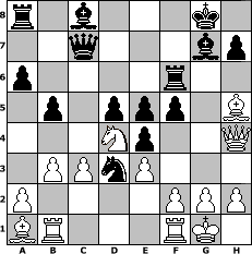 game notation in PGN-format [Event "Zum 2.J"] [Site "www.myChess.de"] [Date "2005.06.22"] [Round "2"] [White "Chaos"] [Black "GIM1961"] [ECO "A03"] [WhitemyELO "1834"] [BlackmyELO "1981"] [Result "0-1"] [TimeControl "10/2592000"] [WhiteDays "00"] [BlackDays "61"] [MyChessNo "14380"] 1. f4 d5 2. Nf3 g6 3. e3 Bg7 4. c3 Nf6 5. Be2 O-O 6. O-O c5 7. d4 Qc7 8. Na3 Nbd7 9. Nb5 Qd8 10. Rb1 a6 11. Na3 b5 12. Nc2 Ne4 13. f5 gxf5 14. Nd2 e6 15. Nxe4 fxe4 16. b3 Qc7 17. Ba3 f5 18. Qe1 Rf7 19. Qh4 cxd4 20. Bh5 Rf6 21. Nxd4 Ne5 22. Bb2 Nd3 23. Ba1 e5 0-1 position notation in FEN-format r1b3k1/2q3bp/p4r2/1p1ppp1B/3Np2Q/1PPnP3/P4PPP/BR3RK1 - - - 0 24 Captured white pieces: ![]() ![]() ![]() ![]() ![]() ![]() ![]() ![]() ![]() ![]() ![]() ![]() ![]() ![]() ![]() Captured black pieces: ![]() ![]() ![]() ![]() ![]() ![]() ![]() ![]() ![]() ![]() ![]() ![]() ![]() ![]() ![]() Click on a captured piece in order to display the desired move!
