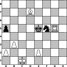 game notation in PGN-format [Event "Albspiele-Chess960"] [Site "www.myChess.de"] [Date "2009.11.08"] [Round "1"] [White "Haki"] [Black "reisender"] [Variant "Fischerrandom"] [SetUp "1"] [FEN "rkqnrnbb/pppppppp/8/8/8/8/PPPPPPPP/RKQNRNBB w KQkq - 0 1"] [WhitemyELO "1458"] [BlackmyELO "1331"] [Result "1-0"] [TimeControl "10/2592000"] [WhiteDays "30"] [BlackDays "30"] [MyChessNo "60474"] 1. e4 h6 2. f4 Bh7 3. d4 g5 4. fxg5 hxg5 5. g4 e5 6. d5 c6 7. Qxg5 cxd5 8. c3 Nfe6 9. Qh4 Bg6 10. Nf2 d4 11. Qg3 dxc3 12. Qxc3 Nc6 13. O-O-O f6 14. Nd2 Bf7 15. Nc4 Qc7 16. Nd3 Ned4 17. h4 Bg7 18. Bh2 Rc8 19. g5 fxg5 20. hxg5 Bf8 21. Ndxe5 d6 22. Nxc6+ Nxc6 23. Bxd6 Bxd6 24. Nxd6 Qxd6 25. Rxd6 Ne7 26. Qxc8+ Nxc8 27. Rd8 a6 28. b3 Ka7 29. Rf1 Be6 30. g6 Ne7 31. Rxa8+ Kxa8 32. Rf8+ Nc8 33. g7 Kb8 34. g8=Q Bxg8 35. Rxg8 Kc7 36. e5 Ne7 37. Rg7 Kd7 38. Bxb7 a5 39. Bc6+ Ke6 40. Bb5 Nf5 41. Bd7+ Kxe5 42. Rg5 1-0 position notation in FEN-format 8/3B4/8/p3knR1/8/1P6/P3P3/2K5 - - - 1 42 Captured white pieces: Captured black pieces: Click on a captured piece in order to display the desired move!