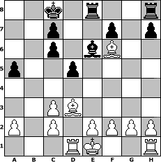 game notation in PGN-format [Event "NoEngine02"] [Site "www.myChess.de"] [Date "2007.11.17"] [Round "1"] [White "Andreas"] [Black "Knight"] [ECO "C45"] [WhitemyELO "1548"] [BlackmyELO "1246"] [Result "1-0"] [TimeControl "10/1728000"] [WhiteDays "10"] [BlackDays "00"] [MyChessNo "39859"] 1. e4 e5 2. Nf3 Nc6 3. d4 exd4 4. Nxd4 Nf6 5. Nc3 Bb4 6. Nxc6 bxc6 7. Qd4 Bxc3+ 8. bxc3 d5 9. Qe5+ Be6 10. Ba3 a5 11. Rd1 Nxe4 12. Qxg7 Qf6 13. Qxf6 Nxf6 14. Bd3 O-O-O 15. Be7 Rde8 16. Bxf6 1-0 position notation in FEN-format 2k1r2r/2p2p1p/2p1bB2/p2p4/8/2PB4/P1P1PPPP/3RK2R - K - 0 16 Captured white pieces: Captured black pieces: Click on a captured piece in order to display the desired move!