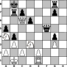 game notation in PGN-format [Event "BdF Chess960 - T960-S03"] [Site "www.myChess.de"] [Date "2006.11.12"] [Round "1"] [White "Hannes"] [Black "jeremyt"] [Variant "Fischerrandom"] [SetUp "1"] [FEN "brknnbrq/pppppppp/8/8/8/8/PPPPPPPP/BRKNNBRQ w KQkq - 0 1"] [WhitemyELO "1500"] [BlackmyELO "1500"] [Result "1/2-1/2"] [TimeControl "10/2592000"] [WhiteDays "82"] [BlackDays "75"] [MyChessNo "30095"] 1. e3 b5 2. Nc3 b4 3. Na4 e5 4. b3 f6 5. Bc4 Ne6 6. O-O-O e4 7. d3 Nd6 8. Ba6+ Bb7 9. Bxb7+ Rxb7 10. g4 h5 11. dxe4 Qh7 12. f3 Qh6 13. f4 hxg4 14. e5 fxe5 15. Bxe5 Qh3 16. Rg3 Qh5 17. Bxd6 Bxd6 18. Qg2 Nxf4 19. exf4 Bxf4+ 20. Kb1 Bxg3 21. hxg3 d6 22. Qc6 Kb8 23. Nd3 a5 24. Re1 Qf5 1/2-1/2 position notation in FEN-format 1k4r1/1rp3p1/2Qp4/p4q2/Np4p1/1P1N2P1/P1P1P3/1K2R3 - - - 2 25 Captured white pieces: ![]() ![]() ![]() ![]() ![]() ![]() ![]() ![]() ![]() ![]() ![]() ![]() ![]() ![]() ![]() Captured black pieces: ![]() ![]() ![]() ![]() ![]() ![]() ![]() ![]() ![]() ![]() ![]() ![]() ![]() ![]() ![]() Click on a captured piece in order to display the desired move!