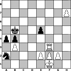 game notation in PGN-format [Event "YOUR LAST BREATH"] [Site "www.myChess.de"] [Date "2019.11.17"] [Round "1"] [White "Gauss1233"] [Black "wolni55"] [ECO "C41"] [WhitemyELO "1428"] [BlackmyELO "1359"] [Result "1-0"] [TimeControl "10/3456000"] [WhiteDays "40"] [BlackDays "40"] [MyChessNo "116307"] 1. e4 e5 2. Nf3 d6 3. d4 Bg4 4. dxe5 Bxf3 5. Qxf3 dxe5 6. Bc4 f6 7. O-O a6 8. Nc3 c6 9. Qf5 Ne7 10. Qe6 b5 11. Qf7+ Kd7 12. Be6+ Kd6 13. b3 Qa5 14. Bd2 b4 15. Na4 Ra7 16. Bc4 Kc7 17. Be3 Kb7 18. Bxa7 Kxa7 19. Qe6 Qc7 20. Rfd1 Qc8 21. Qxc8 Nxc8 22. Rd8 Ne7 23. Nc5 Ng6 24. Ne6 h5 25. Nxf8 Rxf8 26. Rxf8 Nxf8 27. Rd1 Nbd7 28. Rd6 Kb6 29. Be6 Nxe6 30. Rxd7 Nc5 31. Rxg7 Nxe4 32. Rh7 Nc3 33. Rxh5 Nxa2 34. Rf5 Nc1 35. Kf1 c5 36. Rxf6+ Kb5 37. Rf3 Na2 38. h4 a5 39. h5 c4 40. h6 a4 41. h7 cxb3 42. cxb3 1-0 position notation in FEN-format 8/7P/8/1k2p3/pp6/1P3R2/n3PPP1/5K2 - - - 0 42 Captured white pieces: Captured black pieces: Click on a captured piece in order to display the desired move!