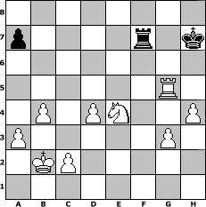 game notation in PGN-format [Event "Maischach"] [Site "www.myChess.de"] [Date "2014.04.26"] [Round "1"] [White "lotchi"] [Black "Haneken"] [ECO "D00"] [WhitemyELO "1345"] [BlackmyELO "1068"] [Result "1-0"] [TimeControl "10/2592000"] [WhiteDays "143"] [BlackDays "142"] [MyChessNo "94113"] 1. d4 d5 2. e4 c6 3. Bd3 e6 4. Nc3 Bb4 5. Bd2 Qd6 6. a3 Bxc3 7. Bxc3 Nf6 8. g3 O-O 9. exd5 Qxd5 10. f3 Ng4 11. Be4 Qc4 12. fxg4 b6 13. Qd3 Ba6 14. b3 Qxd3 15. Bxd3 Rd8 16. Bxa6 Nxa6 17. O-O-O Rd5 18. Nf3 Rad8 19. h4 g6 20. Ne5 Rc8 21. b4 b5 22. Rhf1 Kg7 23. g5 h6 24. gxh6+ Kxh6 25. Rxf7 Rc7 26. Bd2+ Kh5 27. Bf4 Rxf7 28. Nxf7 Kg4 29. Ne5+ Kh3 30. Nxc6 Rd7 31. Ne5 Rc7 32. Nxg6 Rc4 33. Ne5 Rc3 34. Kb2 Rc8 35. Nf3 Kg2 36. Ne1+ Kf2 37. Nd3+ Ke2 38. Re1+ Kf3 39. Re3+ Kg4 40. Nf2+ Kh5 41. Rxe6 Nc7 42. Bxc7 Rxc7 43. Re5+ Kg6 44. Rxb5 Rf7 45. Rg5+ Kh7 46. Ne4 1-0 position notation in FEN-format 8/p4r1k/8/6R1/1P1PN2P/P5P1/1KP5/8 - - - 4 46 Captured white pieces: Captured black pieces: Click on a captured piece in order to display the desired move!