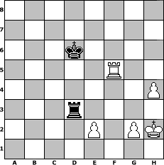 game notation in PGN-format [Event "top10-02"] [Site "www.myChess.de"] [Date "2007.12.06"] [Round "1"] [White "BirdofPray1"] [Black "bjeu"] [ECO "B31"] [WhitemyELO "2223"] [BlackmyELO "2006"] [Result "1-0"] [TimeControl "10/864000"] [WhiteDays "15"] [BlackDays "02"] [MyChessNo "40421"] 1. e4 c5 2. Nf3 Nc6 3. Bb5 g6 4. Bxc6 bxc6 5. O-O Bg7 6. Re1 Nh6 7. c3 O-O 8. d4 cxd4 9. cxd4 d6 10. h3 f6 11. Qc2 Bd7 12. Bf4 Nf7 13. Nbd2 Qc7 14. Nc4 Rab8 15. Rac1 Ng5 16. Nxg5 fxg5 17. Be3 h6 18. b3 Kh7 19. f3 Rb5 20. Qd2 Rd8 21. d5 c5 22. Bf2 Bc8 23. Bg3 Bd4+ 24. Kh1 e5 25. dxe6 Qe7 26. e5 dxe5 27. Rcd1 Bxe6 28. Bxe5 Qf8 29. Bc7 Rd7 30. Rxe6 Rxc7 31. Qc2 Rg7 32. Re1 Rbb7 33. Re8 Qf4 34. R1e4 Qc7 35. R4e6 Rb8 36. Rxb8 Qxb8 37. Nd6 Qb6 38. Qd3 c4 39. bxc4 Bc5 40. Qd1 a5 41. Qb3 Qc6 42. Qc3 Bxd6 43. Qd4 Qa4 44. Rxd6 Qxa2 45. Kh2 Qb1 46. c5 Qb4 47. c6 Qxd4 48. Rxd4 a4 49. Rxa4 Rc7 50. Rc4 Kg7 51. Kg3 Kf6 52. f4 gxf4+ 53. Kxf4 Ke6 54. h4 Kd5 55. Rc2 Kd6 56. Rc3 Rf7+ 57. Kg4 Kc7 58. Rf3 Re7 59. Rf6 Re4+ 60. Kg3 Re3+ 61. Kf4 Rd3 62. Rxg6 Rd4+ 63. Kg3 h5 64. Rg5 Rd3+ 65. Kh2 Kxc6 66. Rxh5 Kd6 67. Rf5 1-0 position notation in FEN-format 8/8/3k4/5R2/7P/3r4/4P1PK/8 - - - 2 67 Captured white pieces: ![]() ![]() ![]() ![]() ![]() ![]() ![]() ![]() ![]() ![]() ![]() ![]() ![]() ![]() ![]() Captured black pieces: ![]() ![]() ![]() ![]() ![]() ![]() ![]() ![]() ![]() ![]() ![]() ![]() ![]() ![]() ![]() Click on a captured piece in order to display the desired move!