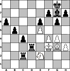 game notation in PGN-format [Event "Adventszeit"] [Site "www.myChess.de"] [Date "2022.11.28"] [Round "1"] [White "Mynona"] [Black "Seneca"] [ECO "A41"] [WhitemyELO "1414"] [BlackmyELO "1503"] [Result "0-1"] [TimeControl "10/1728000"] [WhiteDays "20"] [BlackDays "20"] [MyChessNo "128305"] 1. d4 d6 2. Bf4 Nf6 3. e3 g6 4. c4 Bg7 5. h3 c6 6. b4 a6 7. c5 Nd5 8. Bh2 Nxb4 9. Qb3 dxc5 10. dxc5 Bxa1 11. Qxb4 Bg7 12. g4 Qd5 13. e4 Qxa2 14. Bc4 Qb2 15. Qxb2 Bxb2 16. Ne2 Nd7 17. O-O Nxc5 18. f3 O-O 19. Nd2 Bg7 20. e5 e6 21. f4 b5 22. Ba2 Bb7 23. Nf3 Rfd8 24. Kf2 Ne4+ 25. Kg1 Nd2 26. Nxd2 Rxd2 27. Nc1 c5 28. Bb3 c4 29. Bd1 Rg2+ 30. Kh1 Rg3+ 31. Rf3 Bxf3+ 32. Bxf3 Rxf3 33. Kg2 Rc3 34. Ne2 Rc2 35. Kf3 Rd8 36. Bg3 Rd3+ 0-1 position notation in FEN-format 6k1/5pbp/p3p1p1/1p2P3/2p2PP1/3r1KBP/2r1N3/8 - - - 8 37 Captured white pieces: Captured black pieces: Click on a captured piece in order to display the desired move!