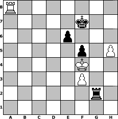 game notation in PGN-format [Event "Winter 2011/12"] [Site "www.myChess.de"] [Date "2011.12.22"] [Round "2"] [White "deepsabel"] [Black "HPB2005"] [ECO "D21"] [WhitemyELO "1984"] [BlackmyELO "1936"] [Result "1/2-1/2"] [TimeControl "10/2592000"] [WhiteDays "071"] [BlackDays "123"] [MyChessNo "78431"] 1. d4 d5 2. c4 dxc4 3. Nf3 c5 4. e3 Nf6 5. Bxc4 e6 6. O-O a6 7. Bb3 Nc6 8. Nc3 Be7 9. dxc5 Qxd1 10. Rxd1 Bxc5 11. Bd2 Ba7 12. Rac1 Ke7 13. Be1 Rd8 14. Rxd8 Kxd8 15. Na4 Nd7 16. Bc3 g6 17. Bc2 f5 18. b4 Ke7 19. e4 h6 20. a3 b5 21. Nb2 Bb6 22. Bg7 a5 23. bxa5 Rxa5 24. exf5 gxf5 25. a4 Nf6 26. Bxh6 Ng4 27. Bg5+ Kf7 28. axb5 Rxb5 29. Nd3 Nce5 30. Nfxe5+ Nxe5 31. Nxe5+ Rxe5 32. h4 Ba6 33. Bd1 Re1+ 34. Kh2 Be2 35. Bxe2 Rxe2 36. f3 Be3 37. Bxe3 Rxe3 38. Kg3 Rd3 39. h5 Rd2 40. Rc8 Kg7 41. Re8 Re2 42. Kf4 Kf7 43. Ra8 Rxg2 1/2-1/2 position notation in FEN-format R7/5k2/4p3/5p1P/5K2/5P2/6r1/8 - - - 0 44 Captured white pieces: Captured black pieces: Click on a captured piece in order to display the desired move!