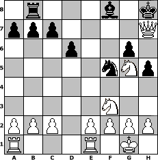 game notation in PGN-format [Event "MySchachOpen"] [Site "www.myChess.de"] [Date "2005.01.22"] [Round "2"] [White "bjeu"] [Black "Fuffy"] [ECO "C57"] [WhitemyELO "1667"] [BlackmyELO "1500"] [Result "1-0"] [TimeControl "10/2592000"] [WhiteDays "89"] [BlackDays "79"] [MyChessNo "9901"] 1. e4 e5 2. Nf3 Nc6 3. Bc4 Nf6 4. Ng5 Qe7 5. Bxf7+ Kd8 6. Bc4 Nxe4 7. Nxe4 d6 8. d4 Nxd4 9. Bg5 Qxg5 10. Nxg5 Bf5 11. Nf7+ Kd7 12. Bd3 Rg8 13. Bxf5+ Nxf5 14. Nxe5+ Ke6 15. Nf3 g6 16. O-O h5 17. Re1+ Kf6 18. Qd5 Rh8 19. Nc3 Rb8 20. Ne4+ Kg7 21. Neg5 Rh7 22. Qf7+ Kh8 23. Qxh7# 1-0 position notation in FEN-format 1r3b1k/ppp4Q/3p2p1/5nNp/8/5N2/PPP1PPPP/R3R1K1 - - - 0 23 Captured white pieces: Captured black pieces: Click on a captured piece in order to display the desired move!
