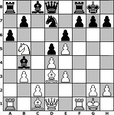 game notation in PGN-format [Event "Schach dem Nikolaus VII"] [Site "www.myChess.de"] [Date "2020.11.23"] [Round "1"] [White "spiderman"] [Black "martinus"] [ECO "A06"] [WhitemyELO "1809"] [BlackmyELO "1689"] [Result "0-1"] [TimeControl "10/2592000"] [WhiteDays "16"] [BlackDays "30"] [MyChessNo "119979"] 1. Nf3 d5 2. e3 e6 3. d4 c5 4. Be2 Nf6 5. Nc3 c4 6. O-O Be7 7. Ne5 O-O 8. f4 Nbd7 9. b3 cxb3 10. axb3 Nxe5 11. fxe5 Nd7 12. Bd3 Bb4 13. Nb5 a6 0-1 position notation in FEN-format r1bq1rk1/1p1n1ppp/p3p3/1N1pP3/1b1P4/1P1BP3/2P3PP/R1BQ1RK1 - - - 0 14 Captured white pieces: Captured black pieces: Click on a captured piece in order to display the desired move!