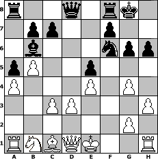 game notation in PGN-format [Event "unter uns Nr. 58"] [Site "www.myChess.de"] [Date "2025.10.15"] [Round "1"] [White "Andreas1954"] [Black "borsti"] [ECO "C20"] [WhitemyELO "1160"] [BlackmyELO "1168"] [Result "0-1"] [TimeControl "10/864000"] [WhiteDays "00"] [BlackDays "19"] [MyChessNo "133763"] 1. e4 e5 2. d3 h6 3. Nf3 Nc6 4. c3 Bc5 5. b4 Bb6 6. a4 a5 7. b5 Nce7 8. Nxe5 d6 9. Nc4 Ng6 10. Be2 Nf6 11. Bh5 Ne5 12. Nxe5 dxe5 13. h3 Be6 14. f3 g6 15. Bg4 Bxg4 16. fxg4 O-O 0-1 position notation in FEN-format r2q1rk1/1pp2p2/1b3npp/pP2p3/P3P1P1/2PP3P/6P1/RNBQK2R - KQ - 1 17 Captured white pieces: Captured black pieces: Click on a captured piece in order to display the desired move!