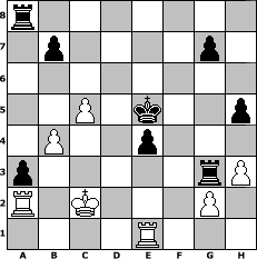 game notation in PGN-format [Event "MNX1"] [Site "www.myChess.de"] [Date "2015.03.13"] [Round "1"] [White "kalle"] [Black "spiderman"] [ECO "B01"] [WhitemyELO "1603"] [BlackmyELO "1735"] [Result "0-1"] [TimeControl "10/2592000"] [WhiteDays "30"] [BlackDays "27"] [MyChessNo "98510"] 1. e4 d5 2. exd5 Qxd5 3. Nc3 Qe6+ 4. Be2 Qg6 5. Bf3 Nf6 6. Nge2 e5 7. d3 Bc5 8. Be3 Bxe3 9. fxe3 O-O 10. Qd2 Na6 11. Ng3 Ng4 12. O-O-O Rd8 13. h3 Nxe3 14. Qxe3 Qxg3 15. Ne4 Qf4 16. Qd2 Qxd2+ 17. Nxd2 f6 18. Kb1 Nc5 19. a3 Be6 20. Kc1 a5 21. Ne4 Nxe4 22. Bxe4 Bd5 23. Rde1 Kf7 24. Rhf1 Bxe4 25. Rxe4 Ke6 26. Rfe1 c5 27. b4 cxb4 28. axb4 a4 29. Kb2 a3+ 30. Kb3 Ra6 31. Ra1 Rda8 32. Ra2 h5 33. Re1 f5 34. Rea1 e4 35. dxe4 fxe4 36. c4 Rd6 37. Re1 Rd3+ 38. Kc2 Ke5 39. c5 Rg3 0-1 position notation in FEN-format r7/1p4p1/8/2P1k2p/1P2p3/p5rP/R1K3P1/4R3 - - - 1 40 Captured white pieces: Captured black pieces: Click on a captured piece in order to display the desired move!