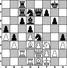 game notation in PGN-format [Event "Winter 2018"] [Site "www.myChess.de"] [Date "2018.01.10"] [Round "2"] [White "larlinde"] [Black "Grubengeist"] [ECO "D11"] [WhitemyELO "2146"] [BlackmyELO "2086"] [Result "1/2-1/2"] [TimeControl "10/2592000"] [WhiteDays "17"] [BlackDays "65"] [MyChessNo "111020"] 1. d4 d5 2. c4 c6 3. Nf3 dxc4 4. e3 Be6 5. Nc3 b5 6. a4 b4 7. Ne2 Bd5 8. Bd2 e6 9. Rc1 Nf6 10. Ng3 Bd6 11. Bxc4 h5 12. h3 Nbd7 13. O-O h4 14. Ne2 Ne4 15. Nf4 Rc8 16. Nxd5 exd5 17. Bd3 O-O 18. Qe2 a5 19. Rfd1 Qe7 20. Be1 Rc7 21. Rc2 Rfc8 22. b3 g6 23. Kf1 1/2-1/2 position notation in FEN-format 2r3k1/2rnqp2/2pb2p1/p2p4/Pp1Pn2p/1P1BPN1P/2R1QPP1/3RBK2 - - - 1 23 Captured white pieces: Captured black pieces: Click on a captured piece in order to display the desired move!