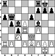 game notation in PGN-format [Event "Bobby Fischer lebt Teil 2"] [Site "www.myChess.de"] [Date "2009.09.02"] [Round "1"] [White "reisinger"] [Black "moses"] [ECO "D10"] [WhitemyELO "1489"] [BlackmyELO "1593"] [Result "0-1"] [TimeControl "10/2592000"] [WhiteDays "90"] [BlackDays "55"] [MyChessNo "58724"] 1. d4 d5 2. c4 c6 3. Nc3 Nf6 4. Bf4 Bf5 5. Nf3 e6 6. a3 dxc4 7. e3 b5 8. a4 Bb4 9. axb5 cxb5 10. Be2 Nd5 11. Qc1 Nxf4 12. exf4 Nc6 13. O-O a6 14. Rd1 Na5 15. Qe3 Nb3 16. Ra2 O-O 17. d5 Bc5 18. Nd4 Nxd4 19. Rxd4 Qb6 0-1 position notation in FEN-format r4rk1/5ppp/pq2p3/1pbP1b2/2pR1P2/2N1Q3/RP1PBPPP/6K1 - - - 1 20 Captured white pieces: Captured black pieces: Click on a captured piece in order to display the desired move!
