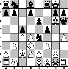 game notation in PGN-format [Event "T960-S07"] [Site "www.myChess.de"] [Date "2009.06.21"] [Round "1"] [White "dschneid@"] [Black "Offi@ (adv.)"] [Variant "Fischerrandom"] [SetUp "1"] [FEN "rnnbbkqr/pppppppp/8/8/8/8/PPPPPPPP/RNNBBKQR w KQkq - 0 1"] [WhitemyELO "1500"] [BlackmyELO "1500"] [Result "0-1"] [TimeControl "10/3456000"] [WhiteDays "00"] [BlackDays "37"] [MyChessNo "56757"] 1. d4 f5 2. b3 Qe6 3. c4 O-O 4. Nd3 Nd6 5. Bc2 Ne4 6. f3 Qh6 7. Nf2 Bg6 8. Nd3 e6 9. h4 c5 0-1 position notation in FEN-format rn1b1rk1/pp1p2pp/4p1bq/2p2p2/2PPn2P/1P1N1P2/P1BPP1P1/RN2BKQR - KQ - 0 10 Captured white pieces: Captured black pieces: Click on a captured piece in order to display the desired move!