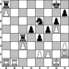 game notation in PGN-format [Event "Love, Peace and Harmony 1"] [Site "www.myChess.de"] [Date "2010.05.08"] [Round "1"] [White "ujack1961"] [Black "espero"] [ECO "B06"] [WhitemyELO "1598"] [BlackmyELO "1669"] [Result "1-0"] [TimeControl "10/864000"] [WhiteDays "32"] [BlackDays "36"] [MyChessNo "65449"] 1. e4 g6 2. Bc4 Bg7 3. Nf3 c6 4. O-O d5 5. exd5 cxd5 6. Bb5+ Nc6 7. d4 Bg4 8. c3 Nf6 9. Bxc6+ bxc6 10. h3 Bf5 11. Ne5 Qb6 12. Qb3 Rc8 13. Qxb6 axb6 14. Bf4 c5 15. Nd2 O-O 16. dxc5 bxc5 17. a4 Nh5 18. Bh2 Bxe5 19. Bxe5 Bd3 20. Rfe1 f6 21. Bh2 e5 22. g4 Ng7 23. b3 c4 24. bxc4 Bxc4 25. Nxc4 Rxc4 26. g5 e4 27. a5 f5 28. a6 Ne6 29. a7 Ra8 30. Reb1 1-0 position notation in FEN-format r5k1/P6p/4n1p1/3p1pP1/2r1p3/2P4P/4PP1B/RR4K1 - - - 2 30 Captured white pieces: Captured black pieces: Click on a captured piece in order to display the desired move!