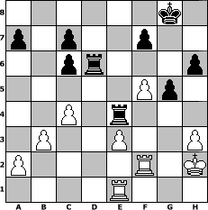 game notation in PGN-format [Event "Es wird bald Sommer"] [Site "www.myChess.de"] [Date "2015.05.12"] [Round "1"] [White "reisinger"] [Black "Gordholm"] [ECO "D08"] [WhitemyELO "1534"] [BlackmyELO "1499"] [Result "1/2-1/2"] [TimeControl "10/2592000"] [WhiteDays "30"] [BlackDays "22"] [MyChessNo "99222"] 1. d4 d5 2. c4 e5 3. dxe5 d4 4. Nf3 Nc6 5. e3 Bb4+ 6. Bd2 dxe3 7. fxe3 Bg4 8. Be2 Nge7 9. O-O Ng6 10. Bxb4 Qxd1 11. Bxd1 Nxb4 12. h3 Be6 13. Ba4+ Nc6 14. Bxc6+ bxc6 15. b3 O-O 16. Nc3 h6 17. Ne2 Rfe8 18. Nf4 Bf5 19. g4 Be4 20. Nxg6 Bxg6 21. Rad1 Rad8 22. Nd4 Be4 23. Rf4 Rxe5 24. Re1 g5 25. Rf6 Rd6 26. Rf2 Bg6 27. Nf5 Bxf5 28. gxf5 Re4 29. Kh2 1/2-1/2 position notation in FEN-format 6k1/p1p2p2/2pr3p/5Pp1/2P1r3/1P2P2P/P4R1K/4R3 - - - 2 29 Captured white pieces: Captured black pieces: Click on a captured piece in order to display the desired move!
