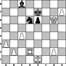 | game notation in PGN-format [Event "Wanderpokal November 2006 -"] [Site "www.myChess.de"] [Date "2006.12.01"] [Round "1"] [White "Jolilein"] [Black "nordlicht"] [Variant "Fischerrandom"] [SetUp "1"] [FEN "brnbkrnq/pppppppp/8/8/8/8/PPPPPPPP/BRNBKRNQ w KQkq - 0 1"] [WhitemyELO "1388"] [BlackmyELO "1969"] [Result "1-0"] [TimeControl "10/864000"] [WhiteDays "10"] [BlackDays "09"] [MyChessNo "30663"] 1. b4 Nd6 2. Nd3 f6 3. Nf3 b6 4. Rb3 e5 5. Nc1 Ne7 6. d3 Kf7 7. e4 Kg8 8. c4 Nc6 9. h4 h5 10. Ne2 Qh7 11. Ng3 Be7 12. Qh3 Rbd8 13. Nd2 g6 14. f4 exf4 15. Rxf4 Qh6 16. Ne2 Ne5 17. Bc3 Ng4 18. Nf1 f5 19. e5 Nf7 20. d4 c5 21. bxc5 bxc5 22. Ba5 Rde8 23. Bd2 cxd4 24. e6 dxe6 25. Rxd4 Kh8 26. Bxh6 Nfxh6 27. Rd7 Rf7 28. Nf4 Kh7 29. Rd2 a5 30. a3 Ne5 31. Qg3 Nhg4 32. Ne3 Bf6 33. Rb5 Rfe7 34. Bxg4 hxg4 35. Rxa5 Nc6 36. Nxg4 fxg4 37. Qxg4 Rg8 38. Rh5+ gxh5 39. Qxh5+ Kg7 40. Qg6+ Kf8 41. Qxf6+ Ke8 42. Ng6 Bb7 43. h5 Bc8 44. Nxe7 Nxe7 45. h6 Rg6 46. Qh4 Nf5 47. Qh5 Nd6 48. Qxg6+ Ke7 49. h7 1-0 position notation in FEN-format 2b5/4k2P/3np1Q1/8/2P5/P7/1P1R2P1/4K3 - - - 0 49 Captured white pieces:                              Captured black pieces:                               Click on a captured piece in order to display the desired move!