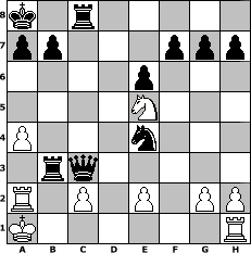 game notation in PGN-format [Event "Winckelmann-Reimer-Gambit"] [Site "www.myChess.de"] [Date "2008.04.22"] [Round "1"] [White "Master1"] [Black "Knight"] [ECO "C15"] [WhitemyELO "1296"] [BlackmyELO "1224"] [Result "0-1"] [TimeControl "10/1728000"] [WhiteDays "59"] [BlackDays "60"] [MyChessNo "44397"] 1. e4 e6 2. d4 d5 3. Nc3 Bb4 4. a3 Bxc3 5. bxc3 dxe4 6. f3 c5 7. fxe4 cxd4 8. Qxd4 Qa5 9. a4 Nf6 10. Bb5+ Bd7 11. Bxd7+ Nbxd7 12. Bd2 O-O-O 13. c4 Qc7 14. Nf3 Nc5 15. Qc3 Ncxe4 16. Qe3 Kb8 17. Bc3 Qxc4 18. Ra3 Ng4 19. Be5+ Ka8 20. Qb3 Nxe5 21. Nxe5 Qd4 22. Qd3 Qf2+ 23. Kd1 Rxd3+ 24. Kc1 Rc8 25. Ra2 Qd2+ 26. Kb1 Rb3+ 27. Ka1 Qc3+ 0-1 position notation in FEN-format k1r5/pp3ppp/4p3/4N3/P3n3/1rq5/R1P1P1PP/K6R - - - 8 28 Captured white pieces: Captured black pieces: Click on a captured piece in order to display the desired move!