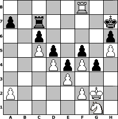 game notation in PGN-format [Event "Herbst 2024"] [Site "www.myChess.de"] [Date "2024.11.17"] [Round "1"] [White "Leon"] [Black "Ziegert"] [ECO "A05"] [WhitemyELO "1945"] [BlackmyELO "2033"] [Result "1-0"] [TimeControl "10/2592000"] [WhiteDays "147"] [BlackDays "005"] [MyChessNo "132560"] 1. Nf3 Nf6 2. Nc3 d5 3. d4 c5 4. dxc5 Nc6 5. e3 e5 6. b4 e4 7. Nd4 Nxb4 8. Nb3 Nc6 9. Bb2 Be7 10. Nce2 O-O 11. Nf4 Na5 12. Rc1 Bg4 13. Be2 Bxe2 14. Qxe2 g5 15. Bxf6 Bxf6 16. Nh5 Bc3+ 17. Kf1 f5 18. h4 g4 19. Nf4 Rf7 20. Rd1 Rd7 21. g3 Be5 22. Nd4 Bxf4 23. gxf4 Qf6 24. Qb5 Nc6 25. Kg2 Kh8 26. Kg3 Rad8 27. c3 Kg8 28. h5 h6 29. Qa4 Kg7 30. Rb1 Rf7 31. Rb2 Nxd4 32. cxd4 Ra8 33. Rhb1 Qc6 34. Rb4 Kg8 35. Kg2 Kg7 36. Qb3 Rb8 37. Kg3 Re7 38. Qa4 Ra8 39. Qxc6 bxc6 40. Rb8 Rxb8 41. Rxb8 Rc7 42. Kg2 Kf7 43. Rh8 Kg7 44. Rb8 Kh7 45. Rf8 1-0 position notation in FEN-format 5R2/p1r4k/2p4p/2Pp1p1P/3PpPp1/4P3/P4PK1/6N1 - - - 8 45 Captured white pieces: Captured black pieces: Click on a captured piece in order to display the desired move!