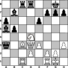 game notation in PGN-format [Event "5erd4"] [Site "www.myChess.de"] [Date "2022.06.29"] [Round "1"] [White "miu"] [Black "spiderman"] [ECO "A46"] [WhitemyELO "1599"] [BlackmyELO "1755"] [Result "0-1"] [TimeControl "10/3456000"] [WhiteDays "117"] [BlackDays "098"] [MyChessNo "126214"] 1. d4 Nf6 2. Nf3 d5 3. h3 e6 4. c4 dxc4 5. Nc3 Bb4 6. Qc2 b5 7. a3 Ba5 8. b4 cxb3 9. Qxb3 O-O 10. Bb2 a6 11. e3 Bb7 12. Be2 Nbd7 13. O-O c5 14. dxc5 Nxc5 15. Qc2 Qe7 16. Rac1 Rac8 17. Qb1 Nfe4 18. Bd3 Nxd3 19. Qxd3 Nxc3 20. Bxc3 Rfd8 21. Nd4 Qxa3 0-1 position notation in FEN-format 2rr2k1/1b3ppp/p3p3/bp6/3N4/q1BQP2P/3P1PP1/2R2RK1 - - - 0 22 Captured white pieces: ![]() ![]() ![]() ![]() ![]() ![]() ![]() ![]() ![]() ![]() ![]() ![]() ![]() ![]() ![]() Captured black pieces: ![]() ![]() ![]() ![]() ![]() ![]() ![]() ![]() ![]() ![]() ![]() ![]() ![]() ![]() ![]() Click on a captured piece in order to display the desired move!