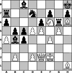 game notation in PGN-format [Event "11er2"] [Site "www.myChess.de"] [Date "2012.06.01"] [Round "1"] [White "espero"] [Black "spiderman"] [ECO "D00"] [WhitemyELO "1681"] [BlackmyELO "1720"] [Result "1-0"] [TimeControl "10/3456000"] [WhiteDays "111"] [BlackDays "095"] [MyChessNo "81948"] 1. d4 d5 2. Bf4 Nf6 3. c4 dxc4 4. Nc3 e6 5. e4 Bb4 6. f3 b5 7. a4 Nh5 8. Be3 c6 9. Kf2 Qh4+ 10. g3 Nxg3 11. hxg3 Qxh1 12. Bg2 Qh5 13. Nge2 O-O 14. Nf4 Qh2 15. Qe2 g5 16. Rh1 Qxh1 17. Bxh1 gxf4 18. Bxf4 a6 19. Bh6 Re8 20. e5 Kh8 21. Ne4 Rg8 22. g4 Ra7 23. Nf6 Rg6 24. g5 Nd7 25. f4 c5 26. d5 1-0 position notation in FEN-format 2b4k/r2n1p1p/p3pNrB/1ppPP1P1/Pbp2P2/8/1P1PQK2/7B - - - 0 26 Captured white pieces: Captured black pieces: Click on a captured piece in order to display the desired move!
