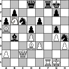 game notation in PGN-format [Event "R"] [Site "www.myChess.de"] [Date "2005.07.20"] [Round "2"] [White "bane"] [Black "GIM1961"] [ECO "D10"] [WhitemyELO "1866"] [BlackmyELO "1998"] [Result "0-1"] [TimeControl "10/2592000"] [WhiteDays "85"] [BlackDays "05"] [MyChessNo "15282"] 1. d4 d5 2. c4 c6 3. e3 Nf6 4. Nf3 Bf5 5. cxd5 cxd5 6. Qb3 Qc7 7. Nc3 e6 8. Nh4 Bg6 9. Nxg6 hxg6 10. Bd2 Nc6 11. Rc1 Qd7 12. Bd3 Bd6 13. h3 Rc8 14. O-O O-O 15. f3 a6 16. Na4 Rc7 17. Nb6 Qe7 18. Rc2 Nh5 19. Qa4 Ng3 20. Rfc1 Nf5 21. f4 Qd8 22. g4 Nh4 23. Rf1 g5 24. f5 Ne7 25. Ba5 Rxc2 26. Qxc2 Nc6 27. fxe6 fxe6 28. b4 Bxb4 0-1 position notation in FEN-format 3q1rk1/1p4p1/pNn1p3/B2p2p1/1b1P2Pn/3BP2P/P1Q5/5RK1 - - - 0 29 Captured white pieces: Captured black pieces: Click on a captured piece in order to display the desired move!