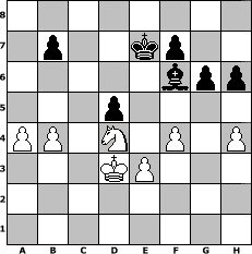 game notation in PGN-format [Event "!!!Turnier in den Sommer!!!"] [Site "www.myChess.de"] [Date "2011.03.02"] [Round "1"] [White "Holzhacker"] [Black "bjeu"] [ECO "B13"] [WhitemyELO "2065"] [BlackmyELO "2086"] [Result "1/2-1/2"] [TimeControl "10/1728000"] [WhiteDays "61"] [BlackDays "04"] [MyChessNo "72477"] 1. e4 c6 2. d4 d5 3. exd5 cxd5 4. c4 Nc6 5. cxd5 Qxd5 6. Nf3 Bg4 7. Nc3 Bxf3 8. gxf3 Qxd4 9. Qxd4 Nxd4 10. Nb5 Ne6 11. Nxa7 Nf6 12. Be3 Nc7 13. Nb5 Ncd5 14. Bc4 e6 15. Ke2 Be7 16. Rac1 O-O 17. Rhd1 Rfd8 18. f4 Nxe3 19. fxe3 Rxd1 20. Rxd1 Rc8 21. Bd3 Rc5 22. Nd4 Rh5 23. Nf3 h6 24. h4 Rc5 25. a3 g6 26. Rd2 Rc7 27. Rc2 Rxc2+ 28. Bxc2 Kf8 29. Kd2 Nd5 30. Be4 Bf6 31. Bxd5 exd5 32. b3 Ke7 33. a4 Ke6 34. Kd3 Kd6 35. b4 Bg7 36. Nd4 Bf6 37. Nf3 Ke6 38. Nd4+ Ke7 1/2-1/2 position notation in FEN-format 8/1p2kp2/5bpp/3p4/PP1N1P1P/3KP3/8/8 - - - 7 39 Captured white pieces: ![]() ![]() ![]() ![]() ![]() ![]() ![]() ![]() ![]() ![]() ![]() ![]() ![]() ![]() ![]() Captured black pieces: ![]() ![]() ![]() ![]() ![]() ![]() ![]() ![]() ![]() ![]() ![]() ![]() ![]() ![]() ![]() Click on a captured piece in order to display the desired move!