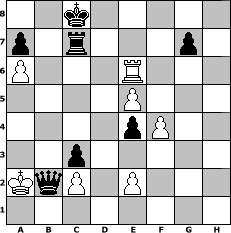 game notation in PGN-format [Event "Februar 2017"] [Site "www.myChess.de"] [Date "2017.02.05"] [Round "1"] [White "Achimkogge"] [Black "Joschi"] [ECO "B12"] [WhitemyELO "1402"] [BlackmyELO "1577"] [Result "0-1"] [TimeControl "10/1728000"] [WhiteDays "102"] [BlackDays "120"] [MyChessNo "106765"] 1. e4 c6 2. d4 d5 3. e5 Bf5 4. Nc3 e6 5. Nf3 Nd7 6. Bg5 Be7 7. h4 Bxg5 8. hxg5 Bg4 9. Rh4 Bxf3 10. Qxf3 Qxg5 11. Rg4 Qh6 12. Rf4 f5 13. Qg3 Ne7 14. Rh4 Qg6 15. Qh3 O-O-O 16. O-O-O h6 17. f4 Kb8 18. Bd3 c5 19. Bb5 cxd4 20. Rxd4 Nc5 21. b4 Ne4 22. Nxe4 dxe4 23. Rxd8+ Rxd8 24. g4 Nc6 25. Bxc6 bxc6 26. Qc3 Rc8 27. Qc5 fxg4 28. Qd6+ Rc7 29. Qd8+ Kb7 30. a4 g3 31. Rh1 Qg4 32. Qd2 h5 33. Rg1 h4 34. a5 h3 35. Kb2 h2 36. Ra1 g2 37. a6+ Kc8 38. Qd6 Qh4 39. Qf8+ Qd8 40. Qc5 h1=Q 41. Rg1 Qhh4 42. Rxg2 Qhe7 43. Qc4 Qd5 44. Kb3 Qxc4+ 45. Kxc4 Qd7 46. Kc3 c5 47. Kc4 Qd4+ 48. Kb3 Qxb4+ 49. Ka2 c4 50. Rg6 c3 51. Rxe6 Qb2# 0-1 position notation in FEN-format 2k5/p1r3p1/P3R3/4P3/4pP2/2p5/KqP1P3/8 - - - 1 52 Captured white pieces: Captured black pieces: Click on a captured piece in order to display the desired move!