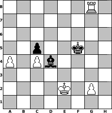 game notation in PGN-format [Event "Clubturnier HSF, Endrunde A"] [Site "www.myChess.de"] [Date "2011.01.15"] [Round "1"] [White "lotchi"] [Black "reisender"] [ECO "B06"] [WhitemyELO "1435"] [BlackmyELO "1383"] [Result "1-0"] [TimeControl "10/2592000"] [WhiteDays "30"] [BlackDays "29"] [MyChessNo "71184"] 1. e4 g6 2. d4 Bg7 3. Nf3 d6 4. Bb5+ Bd7 5. a4 c6 6. Bd3 Nh6 7. h3 e6 8. c3 O-O 9. Be3 e5 10. Bxh6 Bxh6 11. dxe5 dxe5 12. Nxe5 Qe7 13. Nxd7 Nxd7 14. Nd2 Ne5 15. Nf3 Nxd3+ 16. Qxd3 Rad8 17. Qc2 Rfe8 18. O-O Qxe4 19. Qxe4 Rxe4 20. Rfe1 Rde8 21. Rxe4 Rxe4 22. b3 f5 23. Rd1 Re7 24. Rd8+ Kf7 25. Rd3 g5 26. c4 g4 27. hxg4 fxg4 28. Nd4 Bg7 29. f3 Re1+ 30. Kf2 Re8 31. fxg4 c5 32. Nb5 a6 33. Nd6+ Kf8 34. Nxe8 Kxe8 35. Re3+ Kd8 36. Rf3 Bd4+ 37. Ke2 Ke7 38. Rh3 b5 39. Rxh7+ Kf6 40. Rh6+ Kg5 41. Rxa6 bxa4 42. bxa4 Kxg4 43. Rg6+ Kf5 44. Rg8 1-0 position notation in FEN-format 6R1/8/8/2p2k2/P1Pb4/8/4K1P1/8 - - - 3 44 Captured white pieces: ![]() ![]() ![]() ![]() ![]() ![]() ![]() ![]() ![]() ![]() ![]() ![]() ![]() ![]() ![]() Captured black pieces: ![]() ![]() ![]() ![]() ![]() ![]() ![]() ![]() ![]() ![]() ![]() ![]() ![]() ![]() ![]() Click on a captured piece in order to display the desired move!