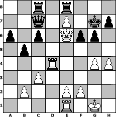 | game notation in PGN-format [Event "Sommersonnenwende"] [Site "www.myChess.de"] [Date "2007.06.15"] [Round "1"] [White "HenrySchinasky"] [Black "Meister64"] [ECO "C80"] [WhitemyELO "1867"] [BlackmyELO "1594"] [Result "1-0"] [TimeControl "10/1728000"] [WhiteDays "80"] [BlackDays "69"] [MyChessNo "35708"] 1. e4 e5 2. Nf3 Nc6 3. Bb5 a6 4. Ba4 Nf6 5. O-O Nxe4 6. d4 b5 7. Bb3 d5 8. dxe5 Be6 9. Nbd2 Nc5 10. c3 Be7 11. Bc2 Bg4 12. Re1 d4 13. Nb3 d3 14. Bb1 Nxb3 15. axb3 Bf5 16. Be3 Qd5 17. Bd4 d2 18. Qxd2 Bxb1 19. Raxb1 Qxb3 20. e6 O-O 21. Qf4 Bd6 22. Qg4 Nxd4 23. Nxd4 Qc4 24. e7 Rfe8 25. Qf3 c6 26. Re4 g6 27. Rd1 Qd5 28. Nc2 Qb3 29. Rxd6 Qxc2 30. Re1 Rac8 31. h4 Qf5 32. Qd1 f6 33. g4 Qf4 34. Rd4 Qc7 35. Qb3+ Kg7 36. Qe6 1-0 position notation in FEN-format 2r1r3/2q1P1kp/p1p1Qpp1/1p6/3R2PP/2P5/1P2PP2/4R1K1 - - - 6 36 Captured white pieces:                              Captured black pieces:                               Click on a captured piece in order to display the desired move!