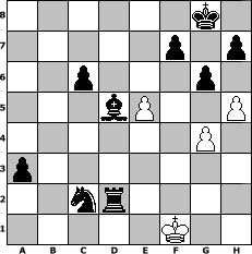 game notation in PGN-format [Event "MySchachOpen"] [Site "www.myChess.de"] [Date "2005.01.22"] [Round "2"] [White "icke"] [Black "tschulz"] [ECO "A04"] [WhitemyELO "1242"] [BlackmyELO "1514"] [Result "0-1"] [TimeControl "10/2592000"] [WhiteDays "143"] [BlackDays "137"] [MyChessNo "9950"] 1. Nf3 g6 2. d4 Bg7 3. e3 c6 4. Ng5 Qa5+ 5. Bd2 Qxg5 6. e4 Qh4 7. Qf3 e5 8. g3 Qf6 9. Qxf6 Nxf6 10. dxe5 Nxe4 11. Bd3 Bxe5 12. Bxe4 Bxb2 13. Bc3 Bxa1 14. Bxa1 O-O 15. O-O Re8 16. Re1 d5 17. f3 dxe4 18. fxe4 Bf5 19. Nd2 Nd7 20. c4 Nc5 21. e5 Rad8 22. Nb3 Nxb3 23. Bb2 Nd2 24. Re2 Nxc4 25. Bc3 Rd1+ 26. Kf2 Bg4 27. Re4 Be6 28. Ke2 Red8 29. a3 b5 30. a4 bxa4 31. Kf2 a3 32. Re2 Nd6 33. Bb4 Nb5 34. Bxa3 Nxa3 35. Re1 Rxe1 36. Kxe1 Nc2+ 37. Ke2 Bc4+ 38. Kf3 Rd4 39. h4 Bd5+ 40. Ke2 a5 41. Kf1 Rd2 42. g4 a4 43. h5 a3 0-1 position notation in FEN-format 6k1/5p1p/2p3p1/3bP2P/6P1/p7/2nr4/5K2 - - - 0 44 Captured white pieces: Captured black pieces: Click on a captured piece in order to display the desired move!