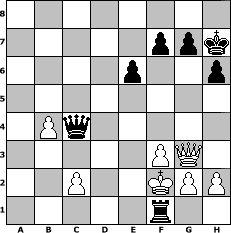 game notation in PGN-format [Event "mal spielen ohne drogen oder der k"] [Site "www.myChess.de"] [Date "2006.04.28"] [Round "1"] [White "FreshPrinc2"] [Black "nogumo"] [ECO "A46"] [WhitemyELO "1436"] [BlackmyELO "1771"] [Result "0-1"] [TimeControl "10/1728000"] [WhiteDays "100"] [BlackDays "080"] [MyChessNo "24930"] 1. d4 Nf6 2. Nf3 e6 3. Bf4 c5 4. Nc3 cxd4 5. Nxd4 a6 6. e4 Bb4 7. f3 O-O 8. Qd3 Nh5 9. Be3 Qh4+ 10. Bf2 Qe7 11. Nde2 Nc6 12. a3 Ba5 13. b4 Bc7 14. Bc5 d6 15. Be3 Ne5 16. Qd2 Nc4 17. Qd3 b5 18. Bf2 Bb7 19. a4 d5 20. axb5 axb5 21. Rxa8 Rxa8 22. Bc5 Ra1+ 23. Kf2 Bb6 24. Bxb6 Nxb6 25. Qxb5 Nc4 26. Kg1 h6 27. Ng3 Qg5 28. Qc5 Nd2 29. Kf2 Qh4 30. Qc7 dxe4 31. Qxb7 Nxg3 32. Qb8+ Kh7 33. Qxg3 e3+ 34. Ke2 Qc4+ 35. Kxe3 Nxf1+ 36. Rxf1 Qxc3+ 37. Kf2 Qd4+ 38. Ke2 Qc4+ 39. Kf2 Rxf1+ 0-1 position notation in FEN-format 8/5ppk/4p2p/8/1Pq5/5PQ1/2P2KPP/5r2 - - - 0 40 Captured white pieces: Captured black pieces: Click on a captured piece in order to display the desired move!