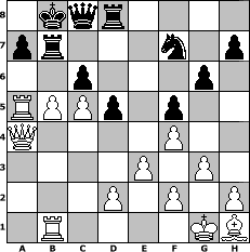 game notation in PGN-format [Event "3. Chess960/2"] [Site "www.myChess.de"] [Date "2009.04.06"] [Round "1"] [White "Alfigator"] [Black "Steffi"] [Variant "Fischerrandom"] [SetUp "1"] [FEN "rqknnrbb/pppppppp/8/8/8/8/PPPPPPPP/RQKNNRBB w KQkq - 0 1"] [WhitemyELO "1508"] [BlackmyELO "1482"] [Result "1-0"] [TimeControl "10/3456000"] [WhiteDays "113"] [BlackDays "092"] [MyChessNo "54664"] 1. f4 f5 2. g3 g6 3. c3 Nd6 4. Qc2 c6 5. Bd4 Bxd4 6. cxd4 Ne6 7. Nf3 Qc7 8. Nc3 O-O-O 9. e3 Qb6 10. Ne5 Nf7 11. Nd5 Qb5 12. Nxe7+ Kb8 13. Nd3 Rfe8 14. Nxg8 Rxg8 15. O-O d5 16. b4 Rge8 17. a4 Qb6 18. a5 Qb5 19. a6 Re7 20. axb7 Rxb7 21. Ra5 Qb6 22. Rc1 Rc7 23. Nc5 Nxc5 24. dxc5 Qb7 25. Rb1 Qc8 26. b5 Rb7 27. Qa4 1-0 position notation in FEN-format 1kqr4/pr3n1p/2p3p1/RPPp1p2/Q4P2/4P1P1/3P1P1P/1R4KB - - - 2 27 Captured white pieces: ![]() ![]() ![]() ![]() ![]() ![]() ![]() ![]() ![]() ![]() ![]() ![]() ![]() ![]() ![]() Captured black pieces: ![]() ![]() ![]() ![]() ![]() ![]() ![]() ![]() ![]() ![]() ![]() ![]() ![]() ![]() ![]() Click on a captured piece in order to display the desired move!