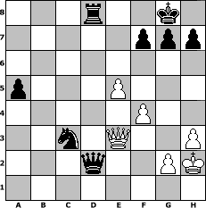 game notation in PGN-format [Event "Smørrebrød-Turnier"] [Site "www.myChess.de"] [Date "2010.03.17"] [Round "1"] [White "bluescreenlover"] [Black "Zoidberg"] [ECO "B01"] [WhitemyELO "1302"] [BlackmyELO "1837"] [Result "0-1"] [TimeControl "10/864000"] [WhiteDays "32"] [BlackDays "38"] [MyChessNo "64025"] 1. e4 d5 2. exd5 Nf6 3. c4 c6 4. Nc3 cxd5 5. d3 Nc6 6. Be2 e5 7. Bg5 d4 8. Ne4 Be7 9. Nh3 Nxe4 10. Bxe7 Qa5+ 11. b4 Nxb4 12. O-O Nc3 13. Bxb4 Qxb4 14. Qd2 Bxh3 15. Rab1 Qe7 16. Rxb7 Qxb7 17. Bf3 e4 18. dxe4 Bd7 19. Qxd4 Qb2 20. Qe5+ Be6 21. Kh1 O-O 22. h3 Bxc4 23. Re1 Bxa2 24. Qg3 a5 25. e5 Rad8 26. Bc6 Bd5 27. Bxd5 Rxd5 28. f4 Rfd8 29. Kh2 Rd3 30. Re3 Rxe3 31. Qxe3 Qd2 0-1 position notation in FEN-format 3r2k1/5ppp/8/p3P3/5P2/2n1Q2P/3q2PK/8 - - - 1 32 Captured white pieces: Captured black pieces: Click on a captured piece in order to display the desired move!