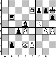 game notation in PGN-format [Event "Zwischendurch mal ein paar eigene Z"] [Site "www.myChess.de"] [Date "2007.11.12"] [Round "1"] [White "Helmut48"] [Black "Naunhofer"] [ECO "C42"] [WhitemyELO "1388"] [BlackmyELO "1660"] [Result "0-1"] [TimeControl "10/1728000"] [WhiteDays "120"] [BlackDays "119"] [MyChessNo "39763"] 1. e4 e5 2. Nf3 Nf6 3. Nc3 Nc6 4. Bb5 Nd4 5. Nxe5 Nxb5 6. Nxb5 d6 7. Nf3 Nxe4 8. O-O Be7 9. Re1 d5 10. d4 O-O 11. c4 c6 12. Na3 Bg4 13. Qd3 Bf5 14. Qe3 Bf6 15. Qb3 b6 16. Bf4 Re8 17. Be5 Qd7 18. Bxf6 Nxf6 19. Ne5 Qd6 20. Qg3 dxc4 21. Rad1 b5 22. Nf3 Qd7 23. h3 h6 24. Ne5 Qd5 25. f3 Rad8 26. Qf2 a5 27. Rc1 Bc8 28. Nb1 Qd6 29. a3 Nd5 30. Nc3 Nxc3 31. bxc3 Re6 32. Ra1 Qc7 33. f4 Rde8 34. f5 Rf6 35. g4 c5 36. Qf4 Kh7 37. Qg3 cxd4 38. cxd4 Qd6 39. Qc3 Bb7 40. Rab1 Qd5 41. Nf3 Qxf3 42. Qxf3 Rxe1+ 43. Kf2 Bxf3 44. Rxe1 Bc6 45. Re5 Rd6 46. Ke3 Bg2 47. h4 Rb6 48. Re7 b4 49. axb4 axb4 50. Kf2 Bd5 51. Ke3 b3 52. Kd2 b2 0-1 position notation in FEN-format 8/4Rppk/1r5p/3b1P2/2pP2PP/8/1p1KP3/8 - - - 0 53 Captured white pieces: Captured black pieces: Click on a captured piece in order to display the desired move!