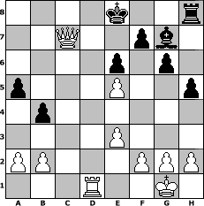 game notation in PGN-format [Event "Bernstein"] [Site "www.myChess.de"] [Date "2022.05.20"] [Round "1"] [White "Mynona"] [Black "Hobbykegler"] [ECO "D00"] [WhitemyELO "1428"] [BlackmyELO "1133"] [Result "1-0"] [TimeControl "10/864000"] [WhiteDays "10"] [BlackDays "07"] [MyChessNo "125812"] 1. d4 d5 2. Bf4 c6 3. e3 h6 4. c4 dxc4 5. Bxc4 b5 6. Be2 Nd7 7. Bf3 Bb7 8. Qc2 a5 9. Bxc6 Bxc6 10. Qxc6 b4 11. Nf3 Ngf6 12. O-O Rc8 13. Qb5 e6 14. Nbd2 h5 15. Rac1 Rb8 16. Bxb8 Qxb8 17. Qa6 Ng4 18. Rc8+ Qxc8 19. Qxc8+ Ke7 20. Nc4 g6 21. Nce5 Ndxe5 22. Nxe5 Nxe5 23. dxe5 Bg7 24. Qc7+ Ke8 25. Rd1 1-0 position notation in FEN-format 4k2r/2Q2pb1/4p1p1/p3P2p/1p6/4P3/PP3PPP/3R2K1 - - - 4 25 Captured white pieces: ![]() ![]() ![]() ![]() ![]() ![]() ![]() ![]() ![]() ![]() ![]() ![]() ![]() ![]() ![]() Captured black pieces: ![]() ![]() ![]() ![]() ![]() ![]() ![]() ![]() ![]() ![]() ![]() ![]() ![]() ![]() ![]() Click on a captured piece in order to display the desired move!