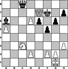 game notation in PGN-format [Event "Dabei ist alles I."] [Site "www.myChess.de"] [Date "2007.11.27"] [Round "1"] [White "bruno"] [Black "rakl"] [ECO "E60"] [WhitemyELO "1464"] [BlackmyELO "1670"] [Result "1-0"] [TimeControl "10/864000"] [WhiteDays "10"] [BlackDays "09"] [MyChessNo "40193"] 1. d4 Nf6 2. c4 g6 3. Nf3 Bg7 4. Nc3 O-O 5. Bf4 d6 6. h3 Nbd7 7. e4 c5 8. d5 Nh5 9. Be3 Ne5 10. Be2 Nxf3+ 11. Bxf3 Nf6 12. O-O e6 13. e5 dxe5 14. Bxc5 Re8 15. d6 Nd7 16. b4 e4 17. Nxe4 Bxa1 18. Qxa1 f5 19. Nc3 Nxc5 20. bxc5 Rb8 21. Rb1 b6 22. cxb6 axb6 23. c5 Ba6 24. Bc6 bxc5 25. Bxe8 Rxb1+ 26. Qxb1 Qxe8 27. Qb6 Bc8 28. Qxc5 Qd7 29. a4 Kf7 30. a5 Ba6 31. Qb6 Qb7 32. Qd8 Qc8 33. Qe7+ 1-0 position notation in FEN-format 2q5/4Qk1p/b2Pp1p1/P4p2/8/2N4P/3P1PP1/6K1 - - - 6 33 Captured white pieces: Captured black pieces: Click on a captured piece in order to display the desired move!