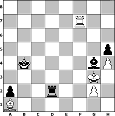 game notation in PGN-format [Event "Godzilla Mannschaftsturnier 2013"] [Site "www.myChess.de"] [Date "2013.08.15"] [Round "1"] [Board "1"] [White "jeremyt"] [Black "HenrySchinasky"] [ECO "B23"] [WhitemyELO "2042"] [BlackmyELO "2132"] [Result "1/2-1/2"] [TimeControl "10/3456000"] [WhiteDays "32"] [BlackDays "40"] [MyChessNo "89706"] 1. e4 c5 2. Nc3 Nc6 3. f4 g6 4. Nf3 Bg7 5. Bb5 Nd4 6. O-O a6 7. Bd3 d6 8. Nxd4 cxd4 9. Ne2 Nf6 10. Kh1 e5 11. c3 O-O 12. cxd4 exd4 13. Ng3 h5 14. Ne2 Qe7 15. Nxd4 Nxe4 16. Nf3 Bg4 17. Bc2 Bd4 18. Bxe4 Qxe4 19. d3 Qd5 20. h3 Bf5 21. Nxd4 Qxd4 22. Qb3 Rae8 23. Bd2 Re2 24. Bc3 Qxd3 25. Rf3 Qe4 26. Raf1 d5 27. Qb6 Qe6 28. Qxe6 fxe6 29. R3f2 Re4 30. Kh2 Rc8 31. Rd2 Kf7 32. Kg3 Rg8 33. h4 b5 34. b3 Rc8 35. Be5 a5 36. Kf3 a4 37. Kf2 a3 38. Rfd1 Ke7 39. Kf1 Kd7 40. Kf2 b4 41. Rf1 Bg4 42. Re1 Rxe1 43. Kxe1 Rc1+ 44. Kf2 Bf5 45. Bf6 Kd6 46. Ke3 Kc6 47. Be7 Kb5 48. Rd4 Re1+ 49. Kf3 Re4 50. Rd2 Bg4+ 51. Kg3 d4 52. Bf6 Re2 53. Rxd4 e5 54. Rd5+ Kc6 55. Rxe5 Rxa2 56. Re4 Re2 57. Rxb4 a2 58. Ra4 Kb5 59. Ra7 Be6 60. Kf3 Rd2 61. Ra3 Kb4 62. Be7+ Kc3 63. Bf6+ Kd3 64. Ra5 Bxb3 65. f5 gxf5 66. Rxf5 Bd1+ 67. Kg3 Kc4 68. Ba1 Kb4 69. Rf7 Bg4 1/2-1/2 position notation in FEN-format 8/5R2/8/7p/1k4bP/6K1/p2r2P1/B7 - - - 7 70 Captured white pieces: Captured black pieces: Click on a captured piece in order to display the desired move!