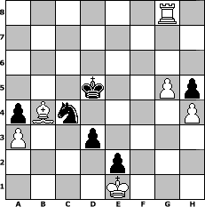 game notation in PGN-format [Event "Ostdeutschland"] [Site "www.myChess.de"] [Date "2008.08.12"] [Round "1"] [White "Gauss1233"] [Black "Pinguin"] [ECO "D07"] [WhitemyELO "1380"] [BlackmyELO "1544"] [Result "1-0"] [TimeControl "10/2592000"] [WhiteDays "148"] [BlackDays "126"] [MyChessNo "47129"] 1. d4 d5 2. c4 Nc6 3. cxd5 Qxd5 4. e3 e5 5. Nc3 Bb4 6. Nge2 Nf6 7. Bd2 Bxc3 8. bxc3 Bf5 9. Ng3 Be6 10. c4 Qd6 11. d5 Bxd5 12. cxd5 Qxd5 13. Qc2 O-O-O 14. Rd1 Qd7 15. Bb5 a6 16. Bxc6 Qxc6 17. Qxc6 bxc6 18. Ba5 Rd5 19. Rxd5 cxd5 20. O-O Re8 21. Rc1 Re7 22. Nf5 Re8 23. Nd6+ Kd7 24. Nxe8 Nxe8 25. f3 c6 26. Kf2 Nd6 27. g3 Nc4 28. Bb4 a5 29. Bc5 Ke6 30. Ke2 f5 31. h4 g6 32. e4 fxe4 33. fxe4 h6 34. g4 h5 35. g5 a4 36. a3 Nd6 37. exd5+ cxd5 38. Rb1 Nc4 39. Rf1 d4 40. Rf6+ Kd5 41. Bb4 e4 42. Rxg6 d3+ 43. Kd1 e3 44. Rg8 e2+ 45. Ke1 1-0 position notation in FEN-format 6R1/8/8/3k2Pp/pBn4P/P2p4/4p3/4K3 - - - 1 45 Captured white pieces: ![]() ![]() ![]() ![]() ![]() ![]() ![]() ![]() ![]() ![]() ![]() ![]() ![]() ![]() ![]() Captured black pieces: ![]() ![]() ![]() ![]() ![]() ![]() ![]() ![]() ![]() ![]() ![]() ![]() ![]() ![]() ![]() Click on a captured piece in order to display the desired move!