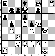 game notation in PGN-format [Event "Aufs neue Jahr!!!"] [Site "www.myChess.de"] [Date "2016.01.06"] [Round "1"] [White "atlantis"] [Black "lotchi"] [ECO "C66"] [WhitemyELO "1581"] [BlackmyELO "1038"] [Result "1-0"] [TimeControl "10/2592000"] [WhiteDays "120"] [BlackDays "090"] [MyChessNo "102013"] 1. e4 e5 2. Nf3 Nc6 3. Bb5 Nf6 4. O-O d6 5. Re1 Bd7 6. c3 a6 7. Ba4 Be7 8. d3 b5 9. Bc2 O-O 10. Nbd2 Be6 11. Nf1 h6 12. h3 Qd7 13. d4 Bc4 14. d5 Nd8 15. Ne3 g5 16. b3 Bxb3 17. axb3 Nb7 18. Nf5 Kh7 19. b4 Bd8 20. h4 gxh4 21. Bxh6 Rg8 22. Bd2 Ne8 23. N3xh4 Nf6 24. Re3 Rg4 25. Rh3 Kg8 26. Nh6+ Kh7 27. Nxg4 Nxg4 28. Nf5+ Kg8 29. Qxg4+ Kf8 30. Rh8# 1-0 position notation in FEN-format r2b1k1R/1npq1p2/p2p4/1p1PpN2/1P2P1Q1/2P5/2BBPPP1/R5K1 - - - 2 30 Captured white pieces: Captured black pieces: Click on a captured piece in order to display the desired move!