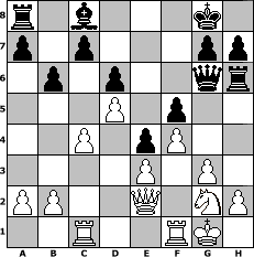 game notation in PGN-format [Event "4. Norderstedter DENK MAL Open 2013"] [Site "www.myChess.de"] [Date "2013.01.09"] [Round "1"] [White "FrankB"] [Black "Tigerle"] [ECO "E12"] [WhitemyELO "1518"] [BlackmyELO "1626"] [Result "1/2-1/2"] [TimeControl "10/2592000"] [WhiteDays "27"] [BlackDays "26"] [MyChessNo "86044"] 1. d4 Nf6 2. c4 e6 3. Nf3 b6 4. Nc3 Bb4 5. Bd2 Bb7 6. e3 O-O 7. Be2 d6 8. O-O Nbd7 9. Rc1 Bxc3 10. Bxc3 Ne4 11. Qb3 f5 12. Rfd1 Rf6 13. d5 e5 14. Nd2 Nxc3 15. Qxc3 Rg6 16. g3 Nf6 17. Nf3 Bc8 18. Nh4 Rh6 19. Qc2 Ne4 20. Ng2 Qg5 21. Bf3 Nf6 22. Be2 Rh3 23. f4 Qg6 24. Rf1 e4 25. Qd2 Ng4 26. Bxg4 Qxg4 27. Qd1 Qg6 28. Qe2 Rh6 1/2-1/2 position notation in FEN-format r1b3k1/p1p3pp/1p1p2qr/3P1p2/2P1pP2/4P1P1/PP2Q1NP/2R2RK1 - - - 4 29 Captured white pieces: Captured black pieces: Click on a captured piece in order to display the desired move!