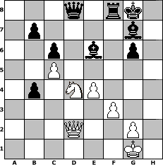 game notation in PGN-format [Event "Es wird Fr"] [Site "www.myChess.de"] [Date "2009.03.13"] [Round "1"] [White "werderfan"] [Black "espero"] [ECO "A85"] [WhitemyELO "1510"] [BlackmyELO "1500"] [Result "0-1"] [TimeControl "10/2592000"] [WhiteDays "120"] [BlackDays "116"] [MyChessNo "53733"] 1. d4 f5 2. c4 Nf6 3. Nc3 d6 4. Bg5 Nbd7 5. e3 g6 6. Nf3 Bg7 7. Bd3 O-O 8. O-O e5 9. dxe5 dxe5 10. Qc2 e4 11. Nd4 exd3 12. Qxd3 Nc5 13. Qc2 c6 14. Rad1 Qe8 15. Rfe1 Nfe4 16. f3 Nxg5 17. b4 Nce6 18. h4 Nf7 19. h5 a5 20. hxg6 hxg6 21. Nxe6 Bxe6 22. e4 f4 23. Ne2 Ne5 24. c5 axb4 25. Nc1 Nc4 26. Nb3 Ne3 27. Rxe3 fxe3 28. Nd4 Rxa2 29. Qd3 Rd2 30. Rxd2 exd2 31. Qxd2 Qd8 0-1 position notation in FEN-format 3q1rk1/1p4b1/2p1b1p1/2P5/1p1NP3/5P2/3Q2P1/6K1 - - - 1 32 Captured white pieces: ![]() ![]() ![]() ![]() ![]() ![]() ![]() ![]() ![]() ![]() ![]() ![]() ![]() ![]() ![]() Captured black pieces: ![]() ![]() ![]() ![]() ![]() ![]() ![]() ![]() ![]() ![]() ![]() ![]() ![]() ![]() ![]() Click on a captured piece in order to display the desired move!