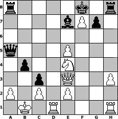 game notation in PGN-format [Event "Anderssen-Club-Meisterschaft"] [Site "www.myChess.de"] [Date "2006.04.11"] [Round "1"] [White "Vouivre"] [Black "romain63"] [ECO "B18"] [WhitemyELO "1582"] [BlackmyELO "1804"] [Result "0-1"] [TimeControl "10/864000"] [WhiteDays "10"] [BlackDays "10"] [MyChessNo "24417"] 1. e4 c6 2. d4 d5 3. Nc3 dxe4 4. Nxe4 Bf5 5. Ng3 Bg6 6. Bc4 e6 7. Nf3 Nd7 8. Be3 Ngf6 9. Qd2 Be7 10. O-O-O b5 11. Bd3 a5 12. Bxg6 hxg6 13. h3 Nd5 14. Ne5 Nxe5 15. dxe5 Qc7 16. f4 c5 17. Ne4 c4 18. g4 b4 19. Qd4 a4 20. f5 gxf5 21. gxf5 a3 22. fxe6 axb2+ 23. Kxb2 Nxe3 24. exf7+ Kf8 25. Qxe3 c3+ 26. Kb1 Qa5 0-1 position notation in FEN-format r4k1r/4bPp1/8/q3P3/1p2N3/2p1Q2P/P1P1P3/1K1R3R - - - 2 27 Captured white pieces: ![]() ![]() ![]() ![]() ![]() ![]() ![]() ![]() ![]() ![]() ![]() ![]() ![]() ![]() ![]() Captured black pieces: ![]() ![]() ![]() ![]() ![]() ![]() ![]() ![]() ![]() ![]() ![]() ![]() ![]() ![]() ![]() Click on a captured piece in order to display the desired move!