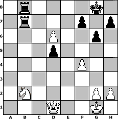 game notation in PGN-format [Event "Etwas Sizilianisch bitte??"] [Site "www.myChess.de"] [Date "2007.02.24"] [Round "1"] [White "hermtz"] [Black "nogumo"] [ECO "B20"] [WhitemyELO "1701"] [BlackmyELO "1687"] [Result "1/2-1/2"] [TimeControl "10/864000"] [WhiteDays "10"] [BlackDays "10"] [MyChessNo "32927"] 1. e4 c5 2. d4 cxd4 3. c3 dxc3 4. Nxc3 g6 5. Nf3 Bg7 6. Bc4 Qc7 7. Qb3 e6 8. Nb5 Qc6 9. Be3 Ne7 10. O-O O-O 11. Rac1 a6 12. Bd3 axb5 13. Rxc6 bxc6 14. Bc5 Re8 15. e5 Bb7 16. Rd1 Nd5 17. Be4 Na6 18. Bd6 Rec8 19. Bxd5 exd5 20. a4 Nc7 21. Bxc7 Rxc7 22. axb5 cxb5 23. Qxb5 Bc6 24. Qe2 Rb7 25. Ne1 Rab8 26. Nd3 Bb5 27. Qc2 Bc4 28. f4 Bb3 29. Qd2 Bxd1 30. Qxd1 d6 31. exd6 Bxb2 32. Nxb2 1/2-1/2 position notation in FEN-format 1r4k1/1r3p1p/3P2p1/3p4/5P2/8/1N4PP/3Q2K1 - - - 0 32 Captured white pieces: Captured black pieces: Click on a captured piece in order to display the desired move!