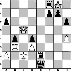 game notation in PGN-format [Event "Clubmeisterschaft der Oldies"] [Site "www.myChess.de"] [Date "2007.04.13"] [Round "1"] [White "muckelmaus"] [Black "niederwerrner"] [ECO "A00"] [WhitemyELO "1486"] [BlackmyELO "1515"] [Result "0-1"] [TimeControl "10/1728000"] [WhiteDays "77"] [BlackDays "71"] [MyChessNo "34088"] 1. e3 e5 2. Nh3 d6 3. e4 Bxh3 4. gxh3 a6 5. Be2 h6 6. d3 Nf6 7. Rf1 Be7 8. Nc3 Nc6 9. f3 Nd4 10. Be3 O-O 11. b4 d5 12. Nxd5 Nxd5 13. exd5 Bxb4+ 14. Bd2 Qh4+ 15. Rf2 Bxd2+ 16. Qxd2 Qxh3 17. c3 b5 18. cxd4 exd4 19. Rb1 Qh5 20. f4 Qxd5 21. Bf3 Rae8+ 22. Kd1 Qd7 23. Rb4 c5 24. Rb3 b4 25. Qc2 Qc7 26. f5 Qe5 27. Re2 Qxf5 28. h4 Qxf3 29. Qxc5 Qxe2+ 30. Kc1 Qe1+ 31. Kc2 Re2# 0-1 position notation in FEN-format 5rk1/5pp1/p6p/2Q5/1p1p3P/1R1P4/P1K1r3/4q3 - - - 4 32 Captured white pieces: Captured black pieces: Click on a captured piece in order to display the desired move!