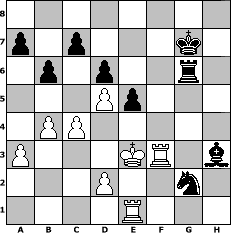 game notation in PGN-format [Event "Zum Vatertag"] [Site "www.myChess.de"] [Date "2017.05.27"] [Round "1"] [White "muellerh"] [Black "FrankB"] [ECO "E20"] [WhitemyELO "1485"] [BlackmyELO "1710"] [Result "0-1"] [TimeControl "10/2592000"] [WhiteDays "110"] [BlackDays "131"] [MyChessNo "108399"] 1. d4 Nf6 2. c4 e6 3. Nc3 b6 4. Bg5 Be7 5. e4 d6 6. Bd3 Bb7 7. d5 O-O 8. Nf3 e5 9. O-O Nbd7 10. b4 Ng4 11. Bxe7 Qxe7 12. h3 Nh6 13. a3 f5 14. exf5 Nxf5 15. Ne4 h6 16. g4 Nh4 17. Nxh4 Qxh4 18. Kg2 Rf4 19. Ng3 Raf8 20. Nf5 Qg5 21. Kg3 Nf6 22. Ne7+ Kf7 23. Ng6 Rd4 24. f4 Rxd3+ 25. Qxd3 Qxg6 26. f5 Qg5 27. Qf3 Nh5+ 28. Kh2 Qf4+ 29. Qxf4 Nxf4 30. Kg3 Kf6 31. h4 Bc8 32. Rae1 Bd7 33. Kf3 Re8 34. Rg1 Rg8 35. Ke4 Kf7 36. Rg3 g6 37. fxg6+ Rxg6 38. g5 hxg5 39. hxg5 Nh3 40. Rf3+ Kg7 41. Ke3 Nxg5 42. Rf2 Nh3 43. Rf3 Nf4 44. Ke4 Bh3 45. Ke3 Ng2+ 0-1 position notation in FEN-format 8/p1p3k1/1p1p2r1/3Pp3/1PP5/P3KR1b/3P2n1/4R3 - - - 8 46 Captured white pieces: Captured black pieces: Click on a captured piece in order to display the desired move!