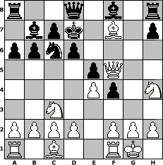 game notation in PGN-format [Event "Eine zentrale Er"] [Site "www.myChess.de"] [Date "2009.05.20"] [Round "1"] [White "ujack1961"] [Black "sel"] [ECO "C60"] [WhitemyELO "1565"] [BlackmyELO "1325"] [Result "1-0"] [TimeControl "10/2592000"] [WhiteDays "60"] [BlackDays "59"] [MyChessNo "55912"] 1. e4 e5 2. Nf3 Nc6 3. Bb5 Nge7 4. O-O a6 5. Be2 f5 6. Nh4 f4 7. Nc3 d6 8. Bc4 g5 9. Qh5+ Kd7 10. Qxg5 b6 11. Bf7 Bb7 12. Qg4+ Nf5 13. Qxf5+ 1-0 position notation in FEN-format r2q1b1r/1bpk1B1p/ppnp4/4pQ2/4Pp1N/2N5/PPPP1PPP/R1B2RK1 - - - 0 13 Captured white pieces: Captured black pieces: Click on a captured piece in order to display the desired move!