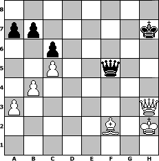 game notation in PGN-format [Event "Ostern 2011"] [Site "www.myChess.de"] [Date "2011.03.18"] [Round "1"] [White "Gauss1233"] [Black "Sanji"] [ECO "E90"] [WhitemyELO "1419"] [BlackmyELO "1519"] [Result "1-0"] [TimeControl "10/2592000"] [WhiteDays "196"] [BlackDays "095"] [MyChessNo "72812"] 1. d4 Nf6 2. c4 g6 3. Nc3 Bg7 4. e4 d6 5. Nf3 O-O 6. Bd3 Bg4 7. h3 Bxf3 8. Qxf3 e5 9. dxe5 dxe5 10. Bg5 h6 11. Bh4 g5 12. Bg3 Nfd7 13. O-O Nc6 14. Rad1 Nd4 15. Qe3 Nc5 16. b4 Nxd3 17. Rxd3 Qe7 18. Nd5 Qd6 19. h4 c6 20. c5 Qd7 21. Nc3 Qe7 22. a3 Rad8 23. hxg5 hxg5 24. Rd1 Nc2 25. Qc1 Rxd3 26. Rxd3 Nd4 27. f3 Rd8 28. Qd1 Qe6 29. Kf2 f5 30. exf5 Qxf5 31. Ne4 g4 32. Nd6 Qf6 33. Ne4 Qf5 34. Nd6 Qf6 35. Ne4 Qf8 36. Nd6 gxf3 37. gxf3 e4 38. Re3 Nxf3 39. Qb3+ Kh7 40. Kg2 Bd4 41. Rxe4 Nd2 42. Qd3 Nxe4 43. Qxe4+ Kg8 44. Qxd4 Rd7 45. Qg4+ Rg7 46. Qe6+ Kh8 47. Nf5 Rf7 48. Nh4 Rf6 49. Ng6+ Rxg6 50. Qxg6 Qe7 51. Bf2 Qd7 52. Qf6+ Kh7 53. Qh4+ Kg8 54. Qg5+ Kh7 55. Qh4+ Kg8 56. Kh2 Qf5 57. Qd8+ Kh7 58. Qh4+ Kg8 59. Qg3+ Kh7 60. Qh3+ 1-0 position notation in FEN-format 8/pp5k/2p5/2P2q2/1P6/P6Q/5B1K/8 - - - 20 60 Captured white pieces: Captured black pieces: Click on a captured piece in order to display the desired move!