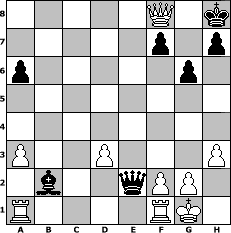 game notation in PGN-format [Event "Eine zentrale Er"] [Site "www.myChess.de"] [Date "2009.05.20"] [Round "2"] [White "Andreas"] [Black "Knight"] [ECO "C77"] [WhitemyELO "1544"] [BlackmyELO "1098"] [Result "1-0"] [TimeControl "10/2592000"] [WhiteDays "88"] [BlackDays "88"] [MyChessNo "55950"] 1. e4 e5 2. Nf3 Nc6 3. Bb5 a6 4. Ba4 Nf6 5. Nc3 Bc5 6. O-O O-O 7. d3 b5 8. Bb3 d6 9. Nd5 Nd4 10. Be3 Nxd5 11. Bxd5 Nxf3+ 12. Qxf3 Bxe3 13. Bxa8 Bh6 14. Bd5 Qd7 15. a3 c6 16. Ba2 Bb7 17. c4 bxc4 18. Bxc4 d5 19. exd5 cxd5 20. Bb3 d4 21. Qe2 Kh8 22. Qxe5 Qg4 23. Bd5 Bxd5 24. Qxd5 g6 25. h3 Qe2 26. Qxd4+ Bg7 27. Qb4 Bxb2 28. Qxf8# 1-0 position notation in FEN-format 5Q1k/5p1p/p5p1/8/8/P2P3P/1b2qPP1/R4RK1 - - - 0 28 Captured white pieces: Captured black pieces: Click on a captured piece in order to display the desired move!