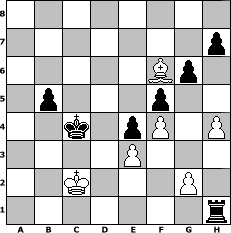game notation in PGN-format [Event "Zwischendurch mal ein paar eigene Z"] [Site "www.myChess.de"] [Date "2009.06.25"] [Round "1"] [White "werderfan"] [Black "murphy12"] [ECO "A56"] [WhitemyELO "1520"] [BlackmyELO "1613"] [Result "0-1"] [TimeControl "10/1728000"] [WhiteDays "100"] [BlackDays "097"] [MyChessNo "56920"] 1. d4 Nf6 2. c4 c5 3. e3 d5 4. dxc5 Qa5+ 5. Qd2 Qxc5 6. cxd5 Nxd5 7. Nc3 Nxc3 8. Qxc3 Qxc3+ 9. bxc3 g6 10. Bb5+ Bd7 11. Bxd7+ Nxd7 12. Ne2 Bg7 13. Bb2 Nc5 14. O-O-O Rc8 15. Kb1 Na4 16. Rd3 Rc6 17. Rhd1 O-O 18. Rd8 f5 19. Rxf8+ Kxf8 20. Nd4 Rb6 21. Rd2 Nxc3+ 22. Ka1 Na4 23. Ba3 Kf7 24. h4 e5 25. Nb3 e4+ 26. Kb1 Nc3+ 27. Kc2 Ke8 28. Nd4 Nxa2 29. Bc5 Bxd4 30. Bxd4 Rc6+ 31. Kb2 Nb4 32. Bxa7 Nd3+ 33. Kb3 Kd7 34. Bb8 b5 35. Ba7 Ke6 36. f4 Rc1 37. Bd4 Kd5 38. Ka2 Kc4 39. Bb2 Rh1 40. Rc2+ Kd5 41. Bf6 Nb4+ 42. Kb3 Nxc2 43. Kxc2 Kc4 0-1 position notation in FEN-format 8/7p/5Bp1/1p3p2/2k1pP1P/4P3/2K3P1/7r - - - 1 44 Captured white pieces: Captured black pieces: Click on a captured piece in order to display the desired move!
